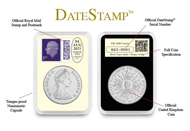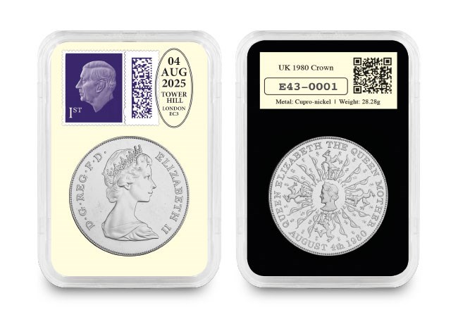 This exclusive collectible features the UK 1980 Crown - originally struck to commemorate the Queen Mother's 80th birthday - now postmarked by the Royal Mail on the official anniversary date: 4th August 2025.