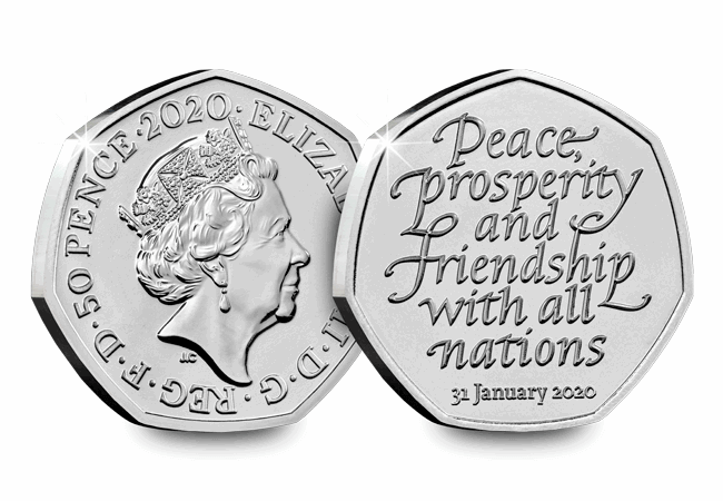This coin has been struck to a Brilliant Uncirculated finish, and features the inscription “Peace, prosperity and friendship with all nations”, as well as the historic date the UK left the EU – 31 January 2020.