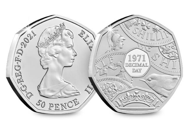 The Decimal Day 50p marks 50 years since decimalisation and features Arnold Machin’s second portrait of Queen Elizabeth II — a design specially re-introduced for the first decimal coins and available only within Annual Coin Collections.