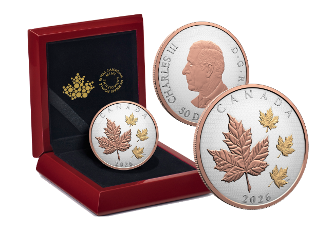 Multifaceted maple leaf centrepiece sparkles when tilted, blending art with coinage.