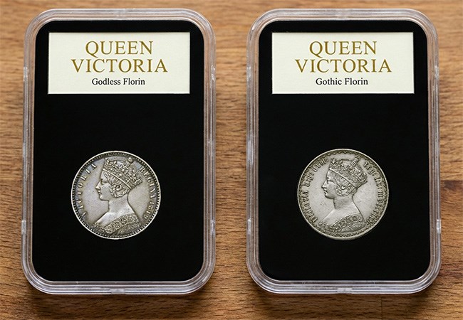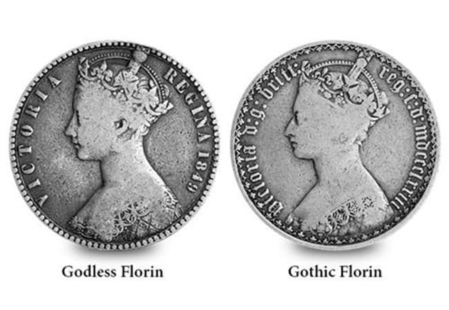 The design excluded the abbreviation of Dei Gratia (Latin for ‘by the Grace of God’). In a society where religion was extremely important, it caused outrage and the coin earned the nickname of the ‘Godless Florin’.
