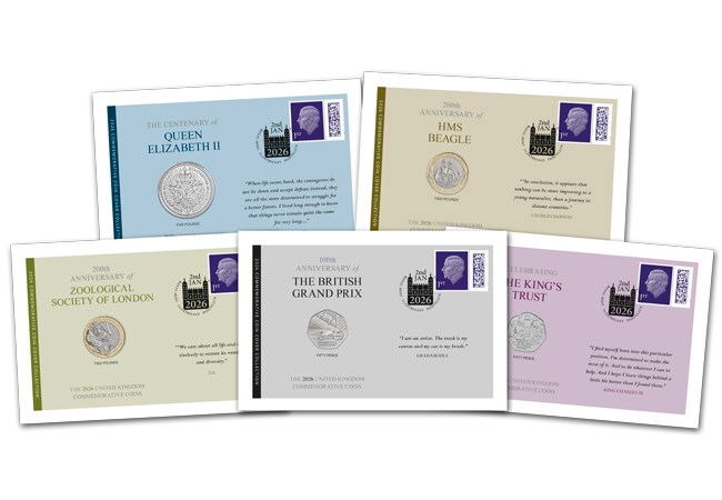 Carefully encapsulated on five separate covers are the brand-new UK 2026 Commemorative Coins, each struck to superior Brilliant Uncirculated Quality…