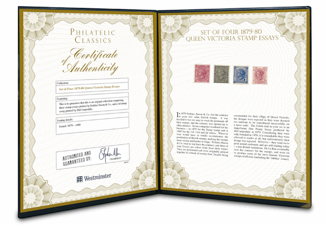 Own a set of four Victorian Stamp Essays. Created in 1879-80 after Perkins, Bacon and Co. lost the contact to print Britain's low value stamps, these four trials were used to tender for the business.