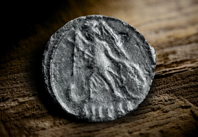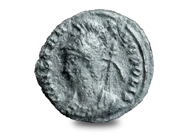Constantinople Coin: Personification of Constantinople with the goddess Victoria, foot resting on a ship’s bow.