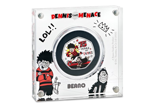 For 75 years, Dennis the Menace has been the whirlwind at the heart of the Beano. Now he leaps from comic to coin in Silver Proof quality.