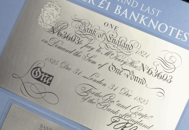 Today you have the chance to pay tribute the iconic £1 banknote with FINE SILVER reproductions of the first and last banknote designs.